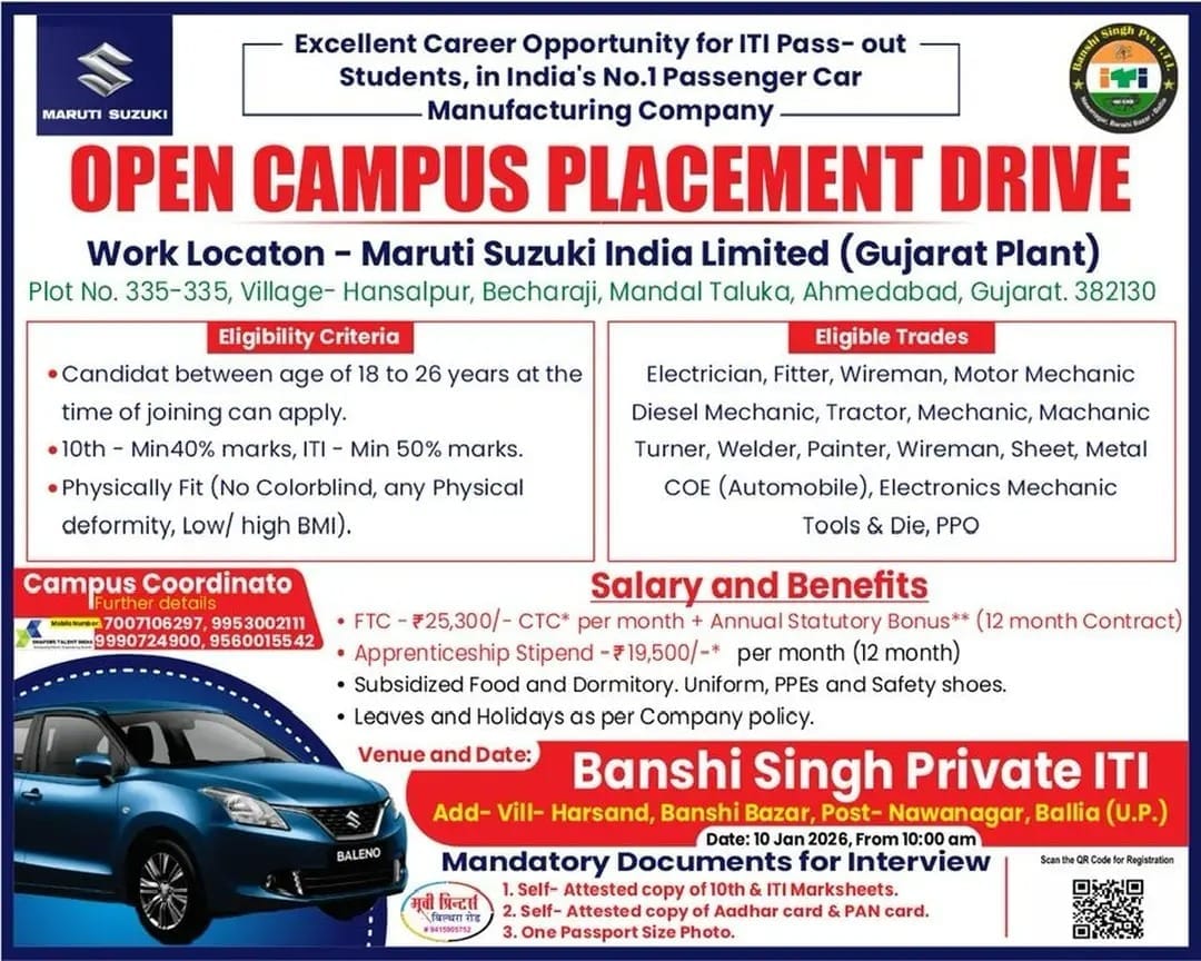 Latest Private Company Jobs 2026 – India की No.1 passenger car manufacturing company Maruti Suzuki India Limited द्वारा ITI pass students के लिए Open Campus Placement Drive 2026 आयोजित किया जा रहा है। यह भर्ती Private Company Job के अंतर्गत है, जिसमें candidates को Gujarat Plant में work करने का opportunity मिलेगा।