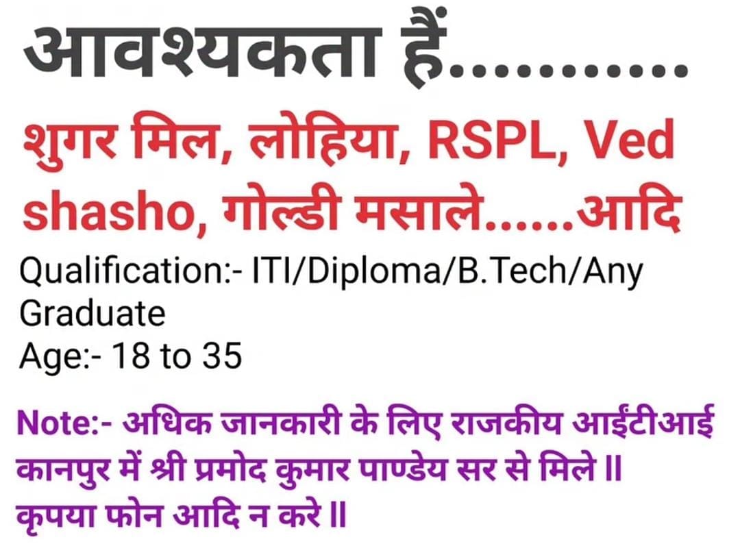 कृपया ध्यान दें — फोन पर जानकारी नहीं दी जाएगी, उम्मीदवारों को स्वयं जाकर जानकारी प्राप्त करनी होगी। यह अवसर उन युवाओं के लिए खास है जो अपने करियर की शुरुआत प्राइवेट इंडस्ट्री में करना चाहते हैं।